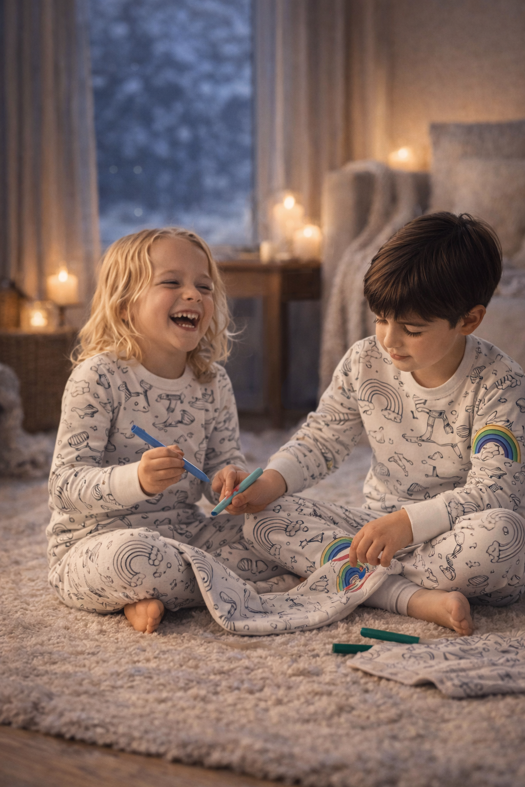 Des motifs à colorier, un tissu doux, un moment calme à partager… chaque pyjama accompagne votre enfant vers une transition sereine vers la nuit.